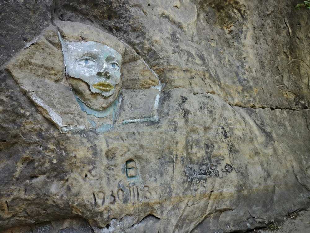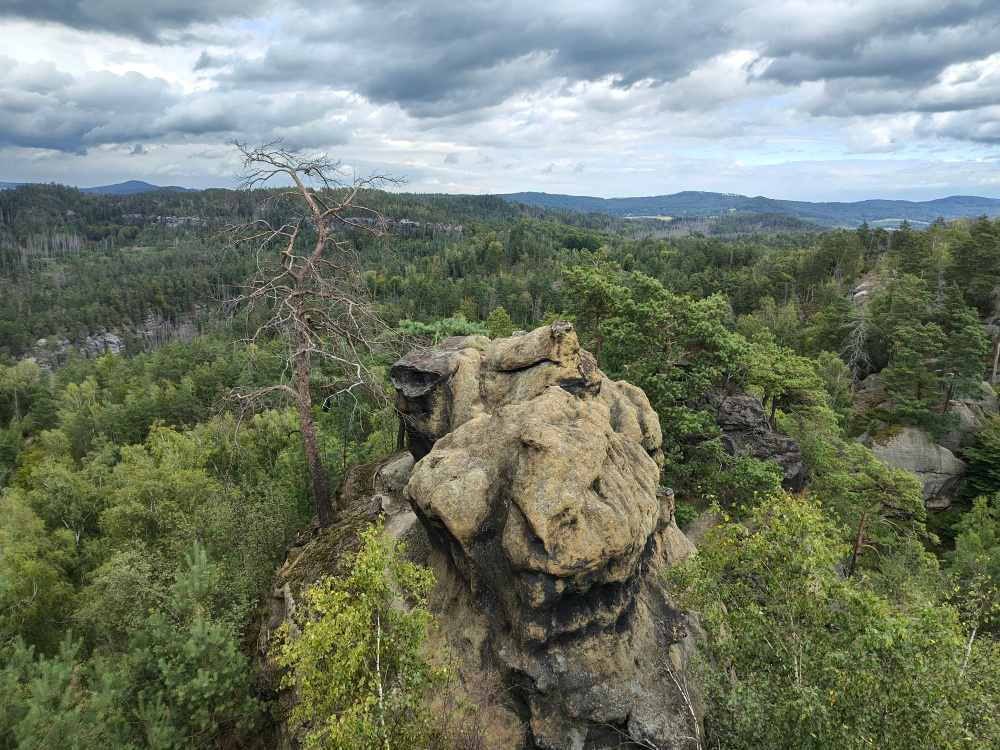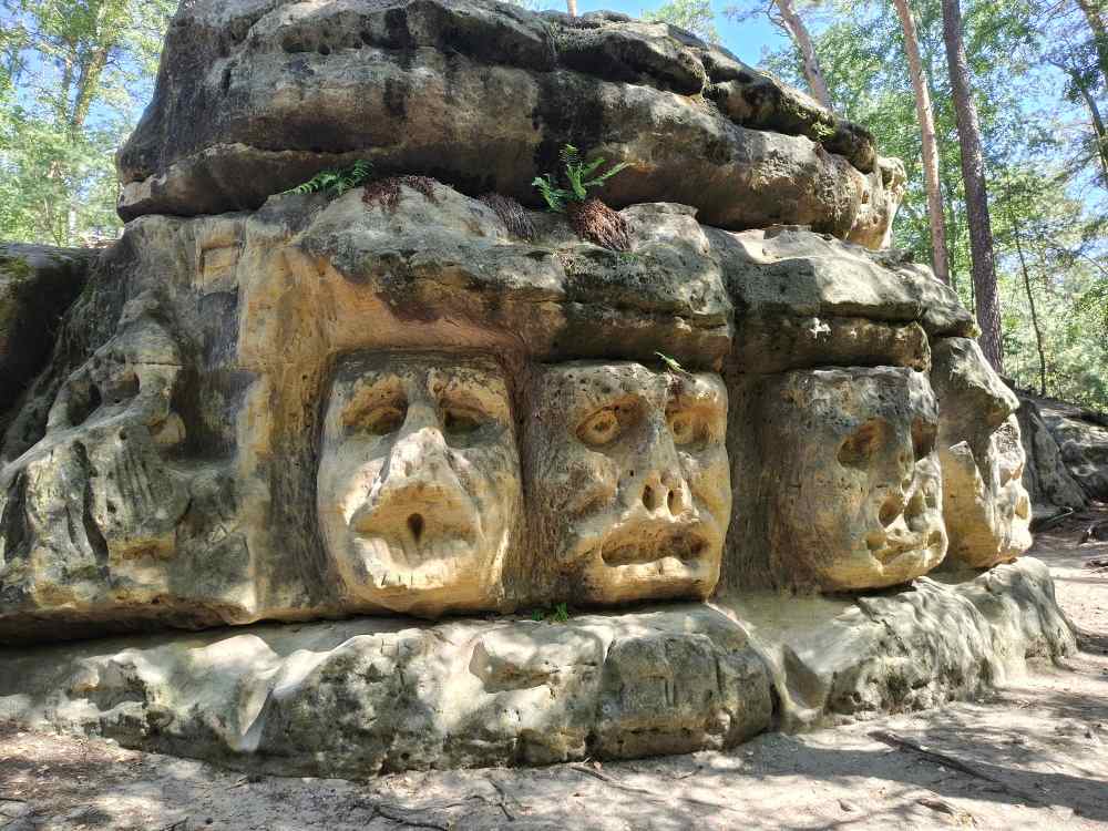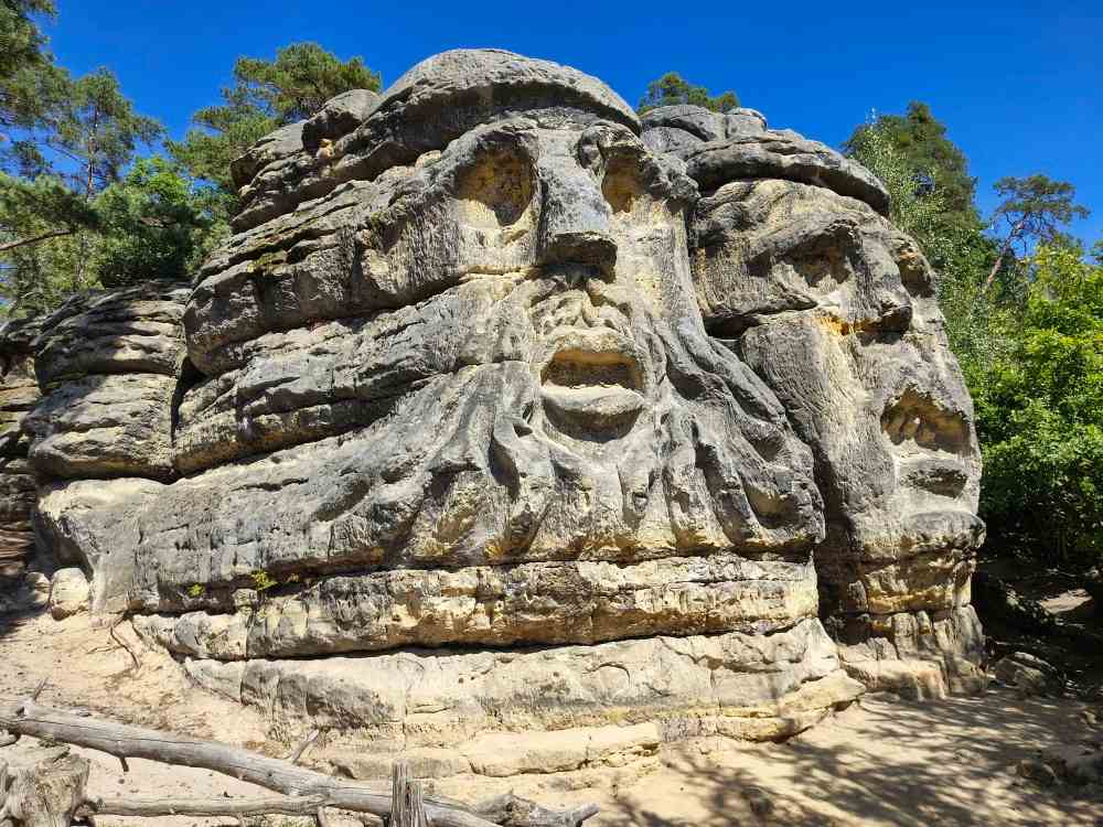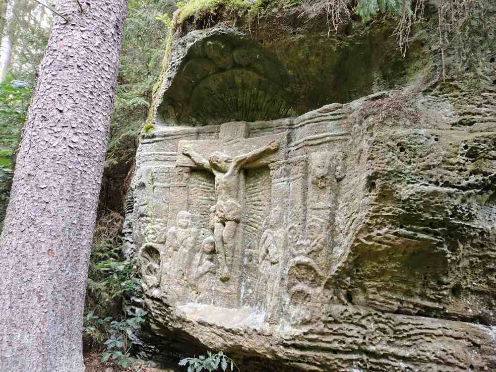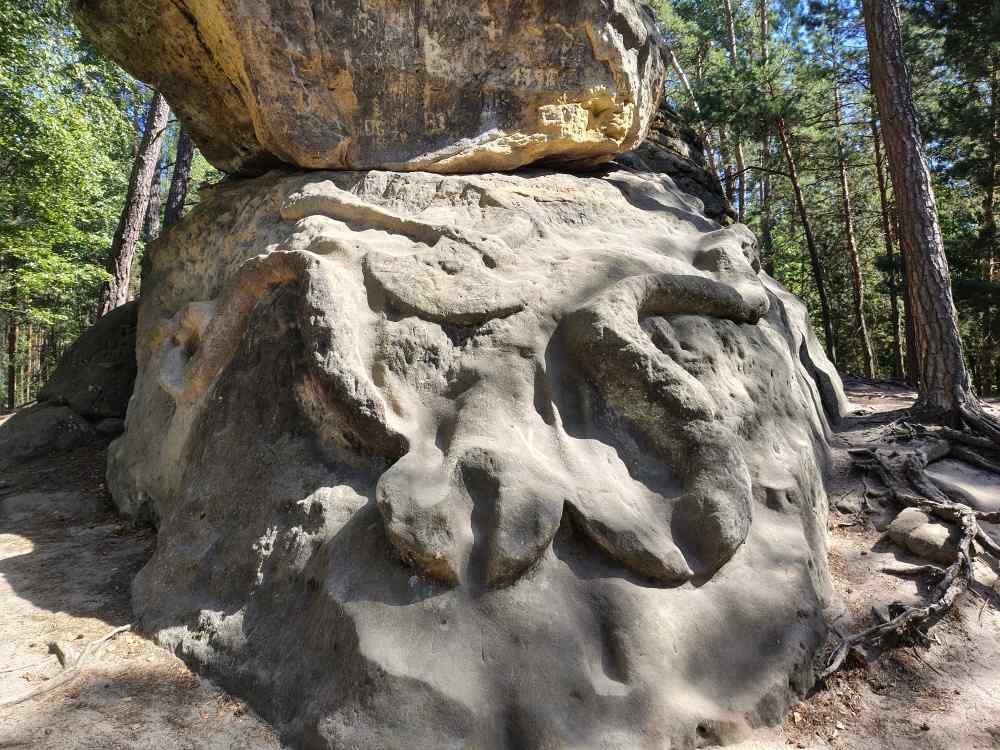 Pak následoval krátký výlet do skal. Ještě než jsem se stihl podívat na mapu, už jsme to přešli a museli se vracet. Nakonec jsme našli vytesaného Ježíše v pískovci a užili si stoupání po kořenové cestě na skalní Pokličky. I s menší zacházkou jsme to zvládli za hodinku.