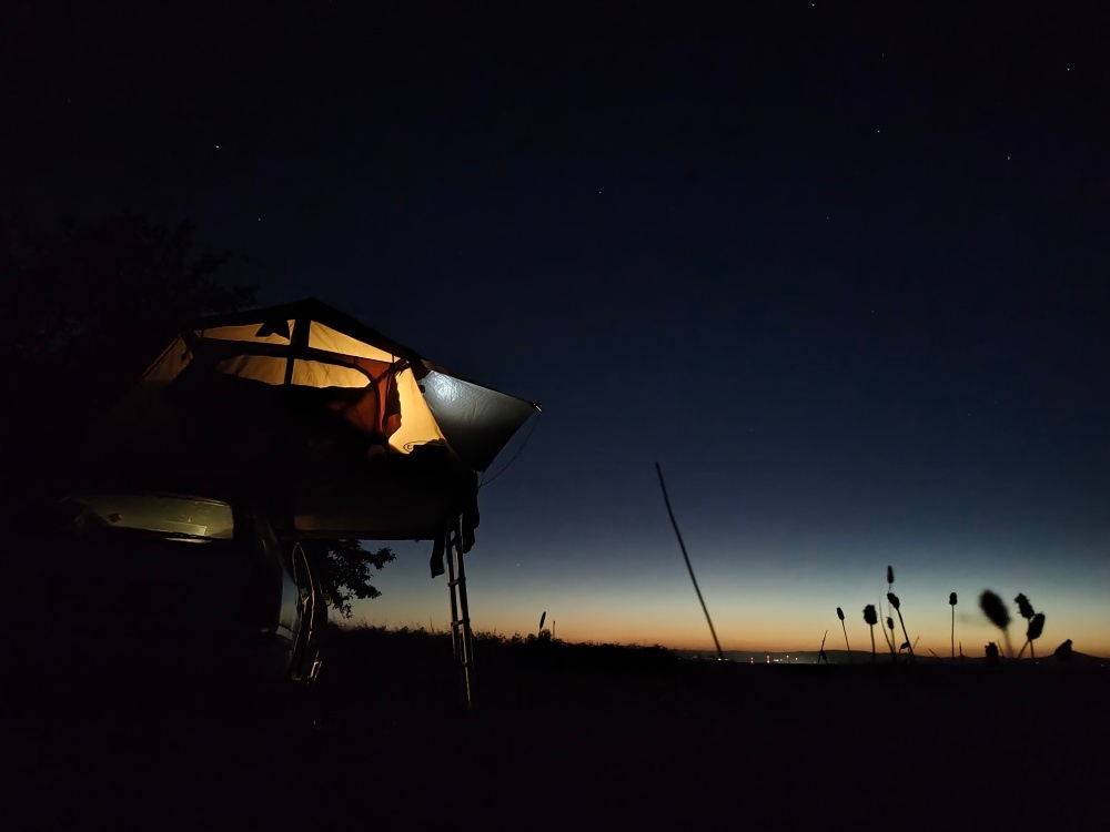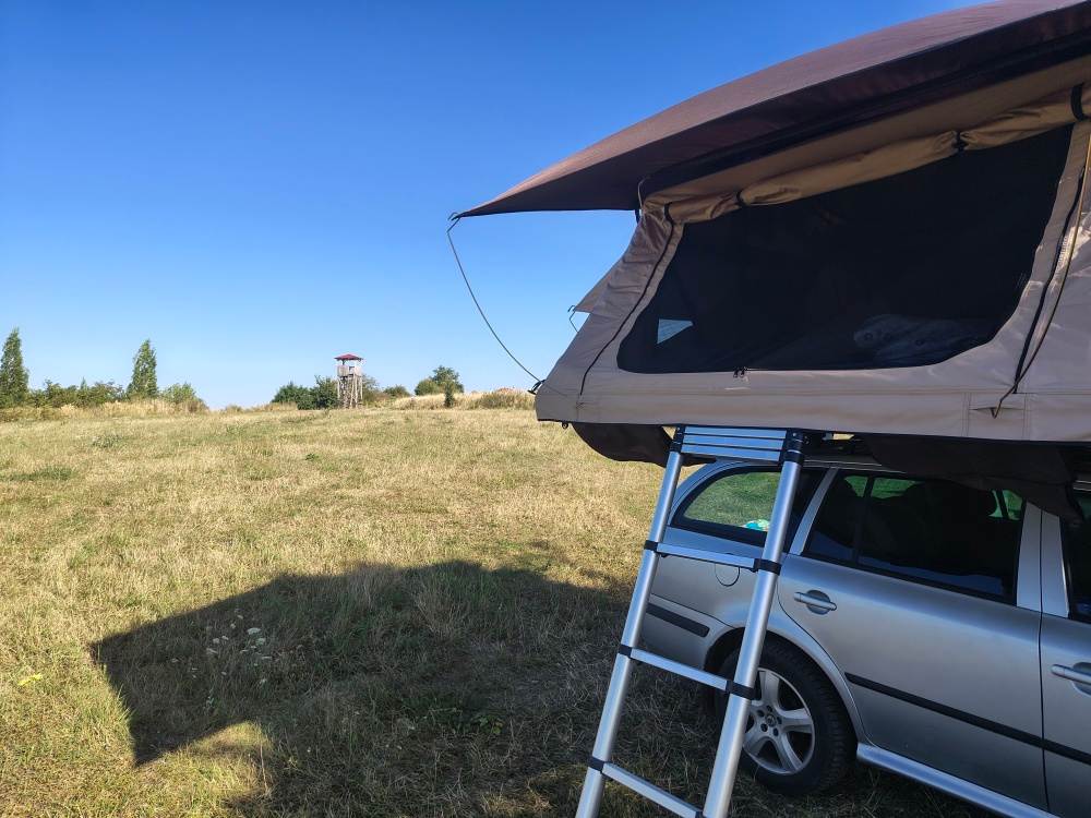 Bylo už docela dost hodin, a tak jsme se vydali hledat místo na kempování. Cestou jsme objevili tábořiště u rozhledny, kde nikdo nebyl a na internetu nešlo dohledat žádné ceny ani podrobnosti. Je tu ale krásný výhled a je to blízko, tak jsme si řekli, že to zkusíme. Dnes potřebujeme jít spát brzy.