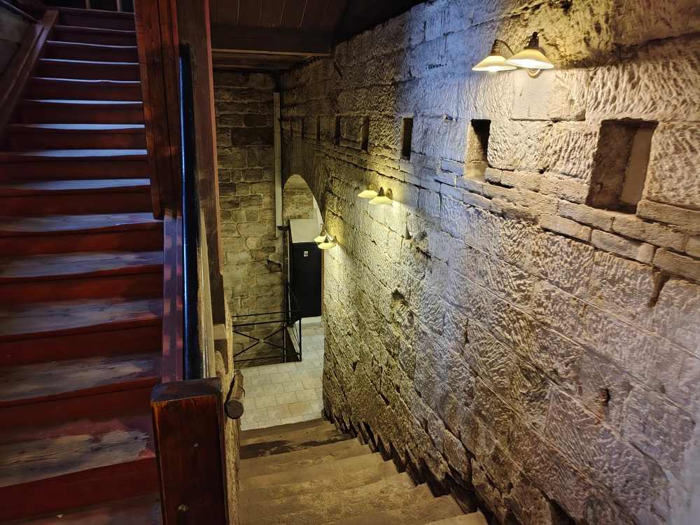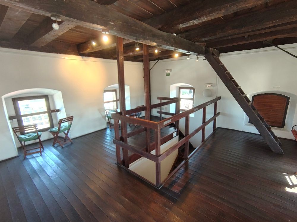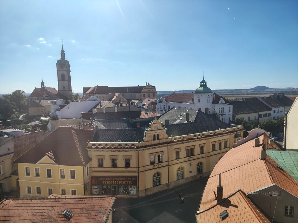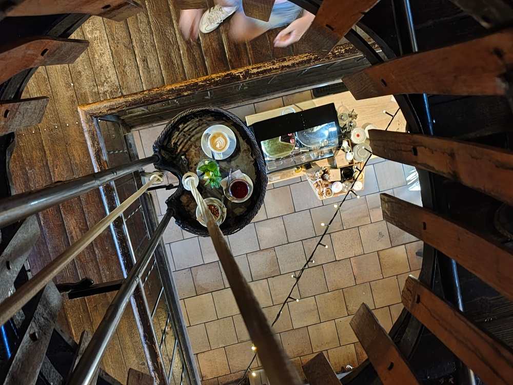 Po návratu k autu jsme řešili docházející vodu. Rozhodli jsme se pro kavárnu ve věži a pramen na náměstí. Nabrali jsme vodu a využili rezervaci, kterou nám Terka udělala cestou. Je to fakt kavárna ve věži – seděli jsme ve 4. patře a zákusky nám nahoru vyvezl výtah. Nad námi byla ještě galerie o dvě patra výš. Skvělý nápad. Děti si nedaly zákusek, s tím že si raději dají zmrzlinu. Povídaly o ní celou dobu…