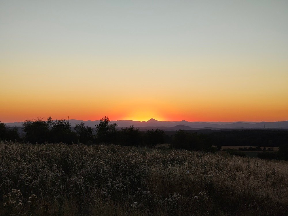 Klasika: vyčistit zuby, připravit spaní. Západ slunce nad Milešovkou byl parádní. Dnes půjdeme spát brzy i my.