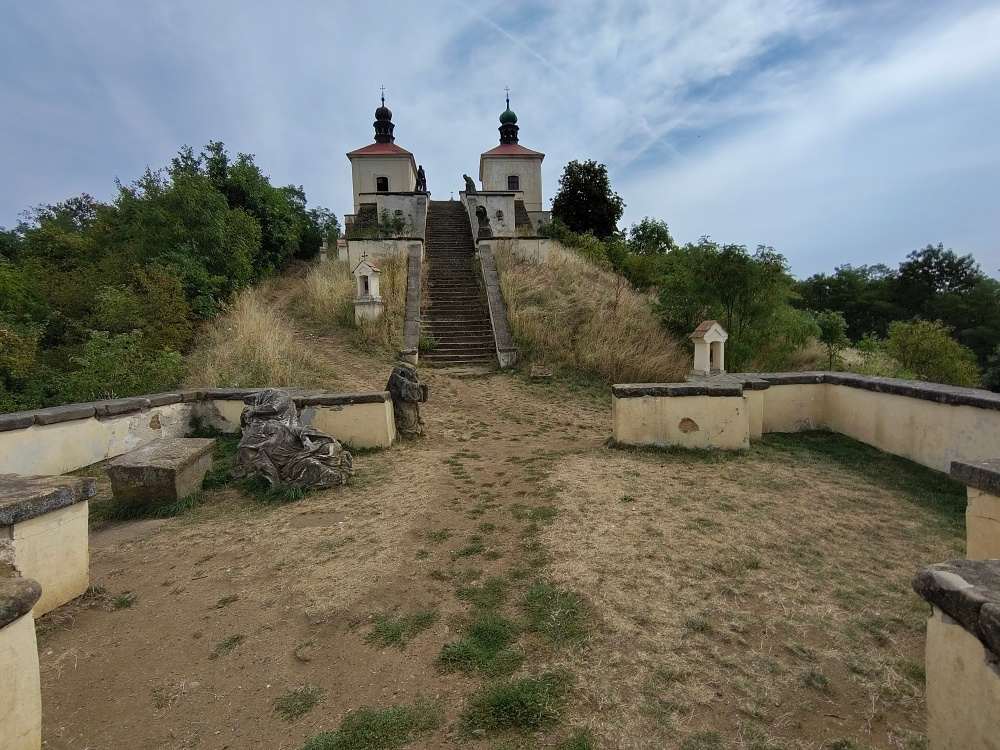 Popojeli jsme asi kilometr a vyšli si na poutní místo Kalvárie. Je to dvojice kapliček na kopci s krásným schodištěm a výhledem do kraje. Vysvětlovat dětem křížovou cestu byl docela oříšek. Místo má každopádně parádní atmosféru a výhled byl skvělý.