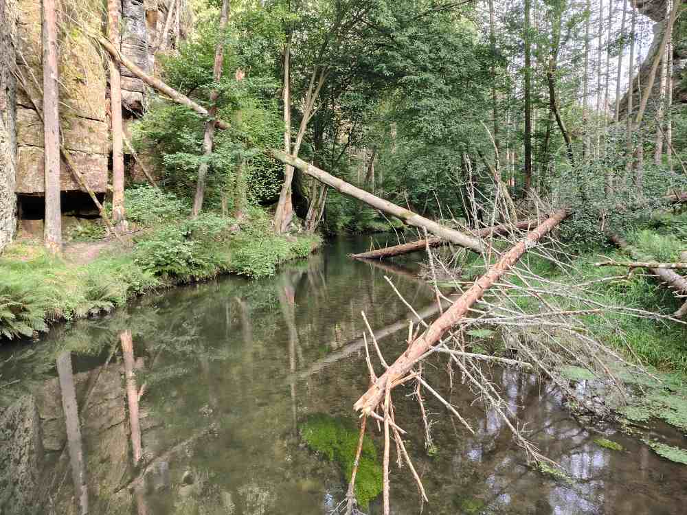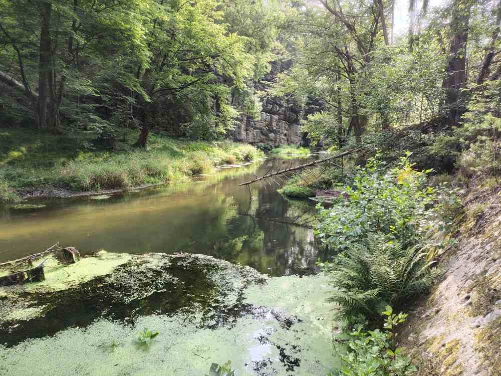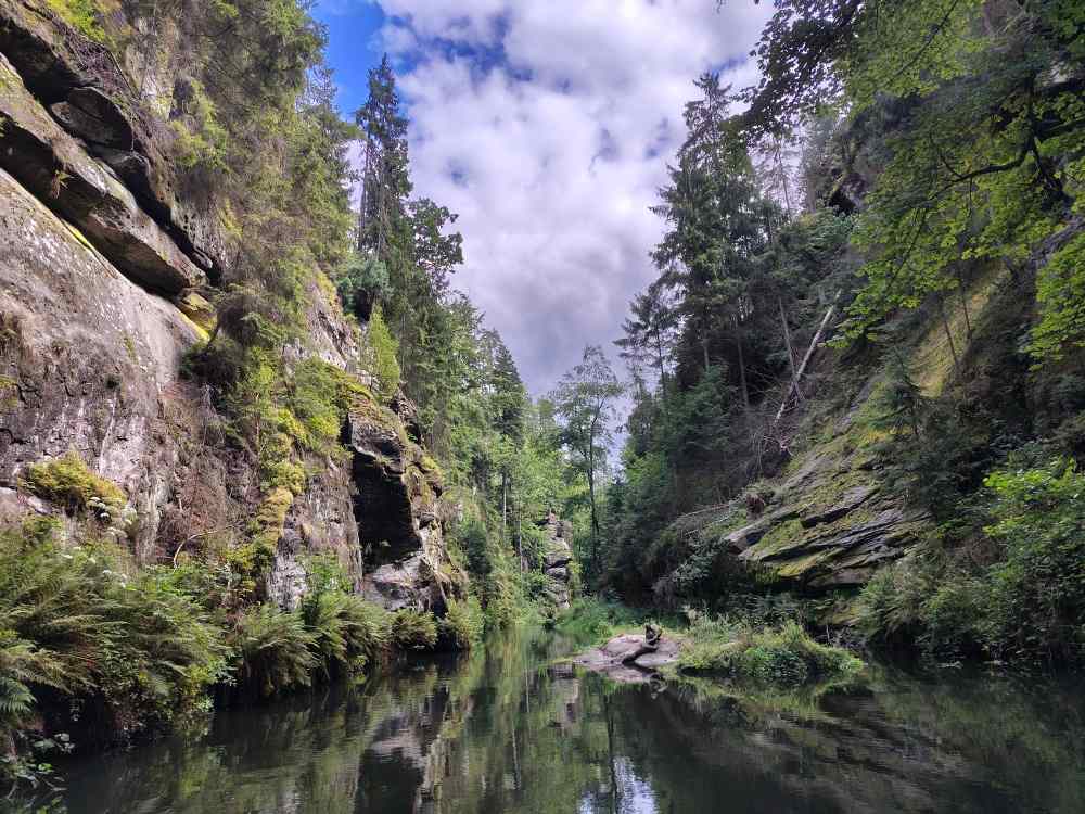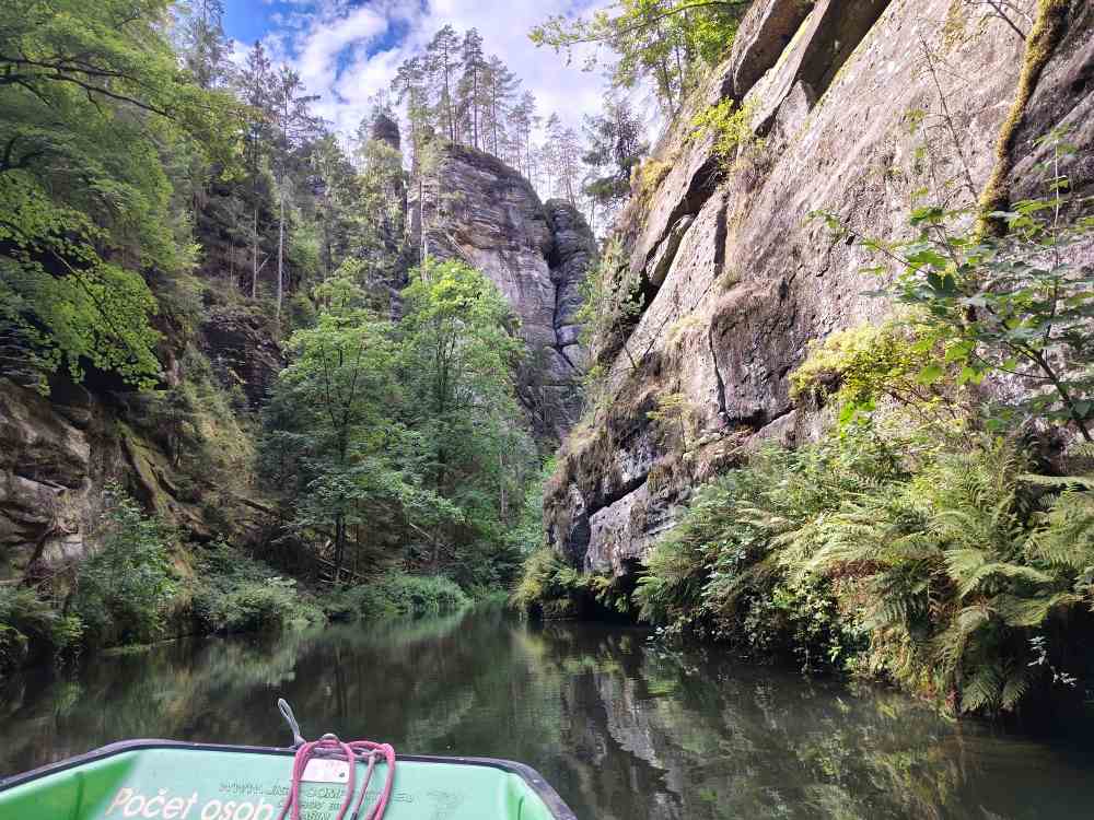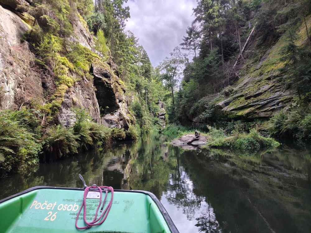 Pak následovala cesta do Hřenska, potažmo do Mezné, odkud jsme sešli roklí dolů do Divoké soutěsky a projeli se na loďce. Vedlejší Edmundova soutěska byla dnes kvůli větru a riziku pádu stromů zavřená. Měli jsme sice čas, ale nedalo se.